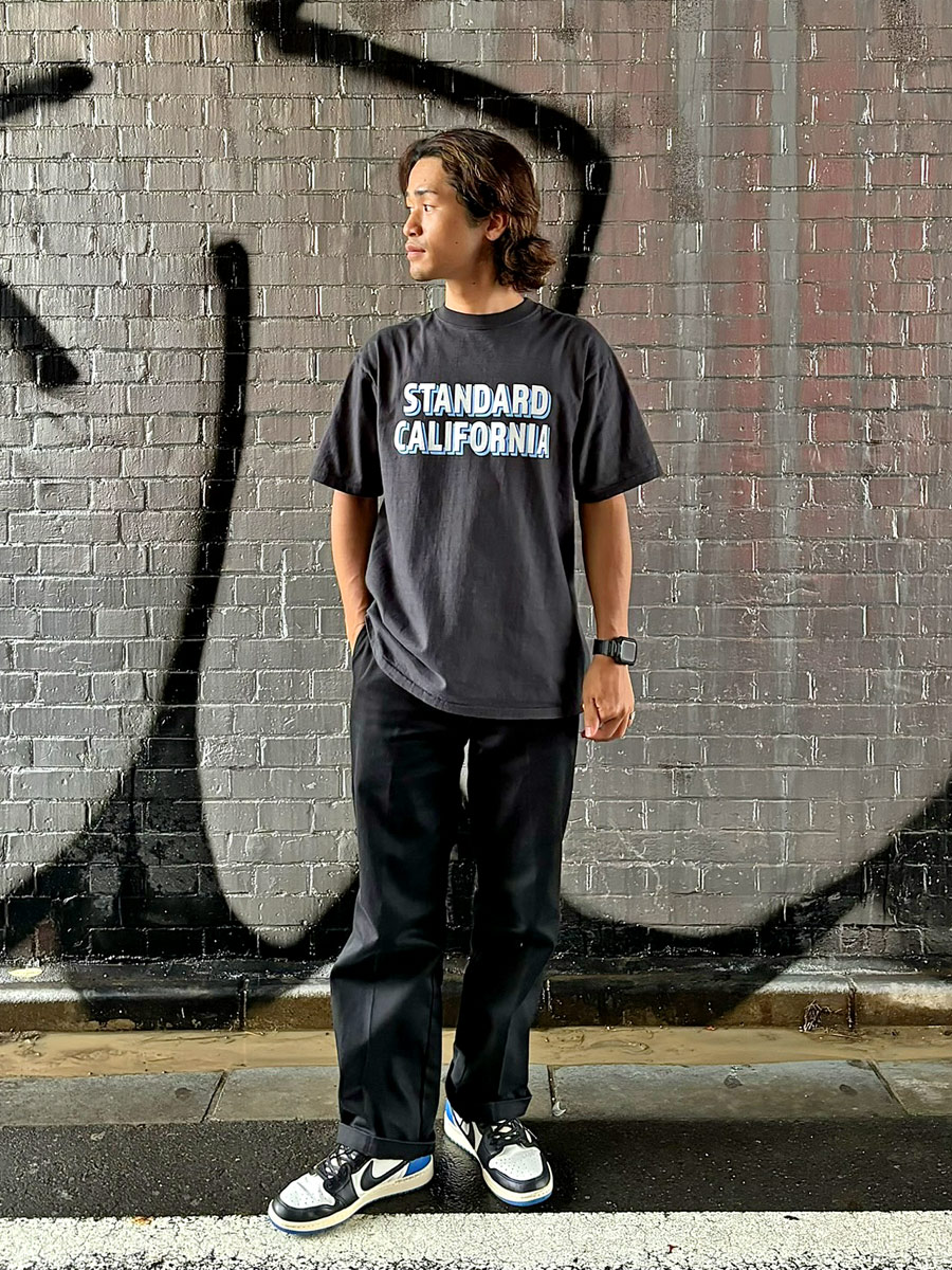 ボトムはディッキーズのブラックでシューズとTシャツで色を合わせ、シンプルにまとめてみました。