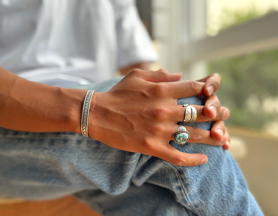その隣のターコイズのリングはナバホ族とズニ族のハーフのAlex Sanchez(アレックスサンチェス)というアーティストの作品。ターコイズのリングを探していて、こちらも一目惚れで購入。