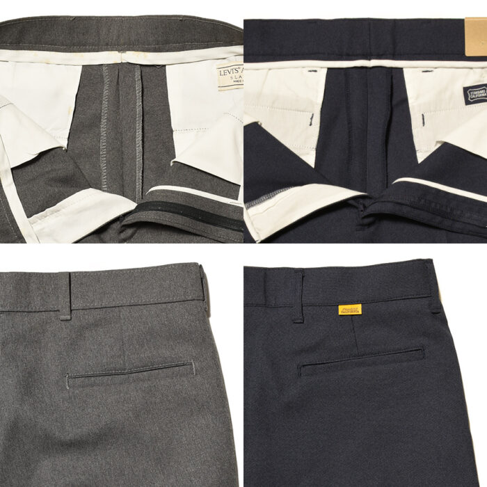 裏ベルトの処理や、後ろ中心のサイズ調整が可能な縫い割り仕様など基本的にはスラックスらしいディティールはヴィンテージ同様。