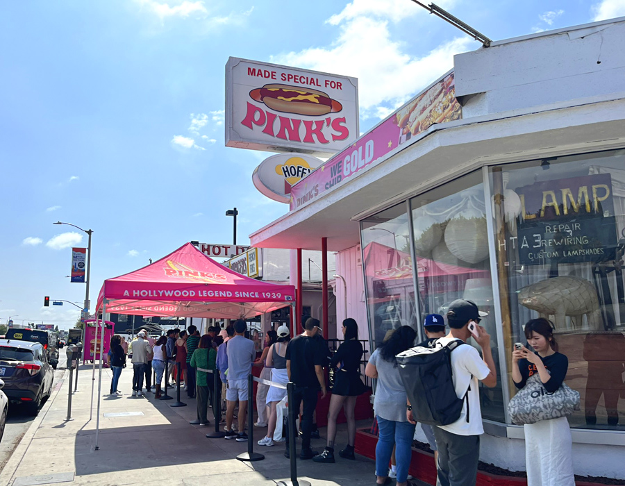 ピンクスは1939年にホットドッグスタンドから始まり、温められたパンにチリソースのかかったチリドッグが人気を呼び、ハリウッドの名所のひとつになっています。