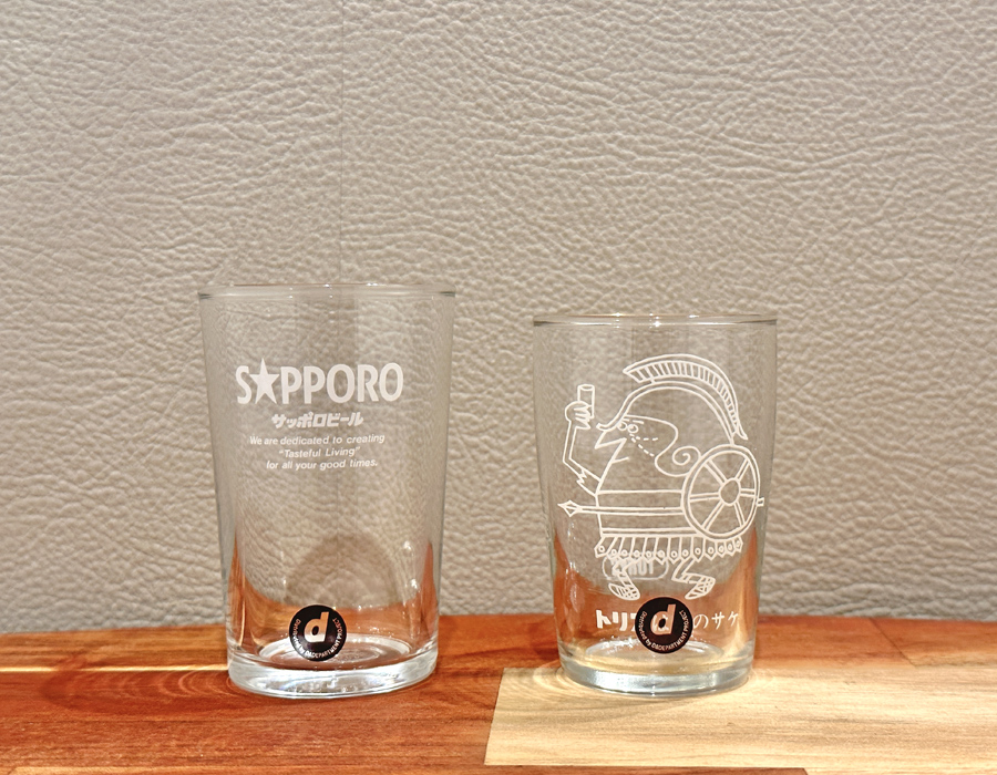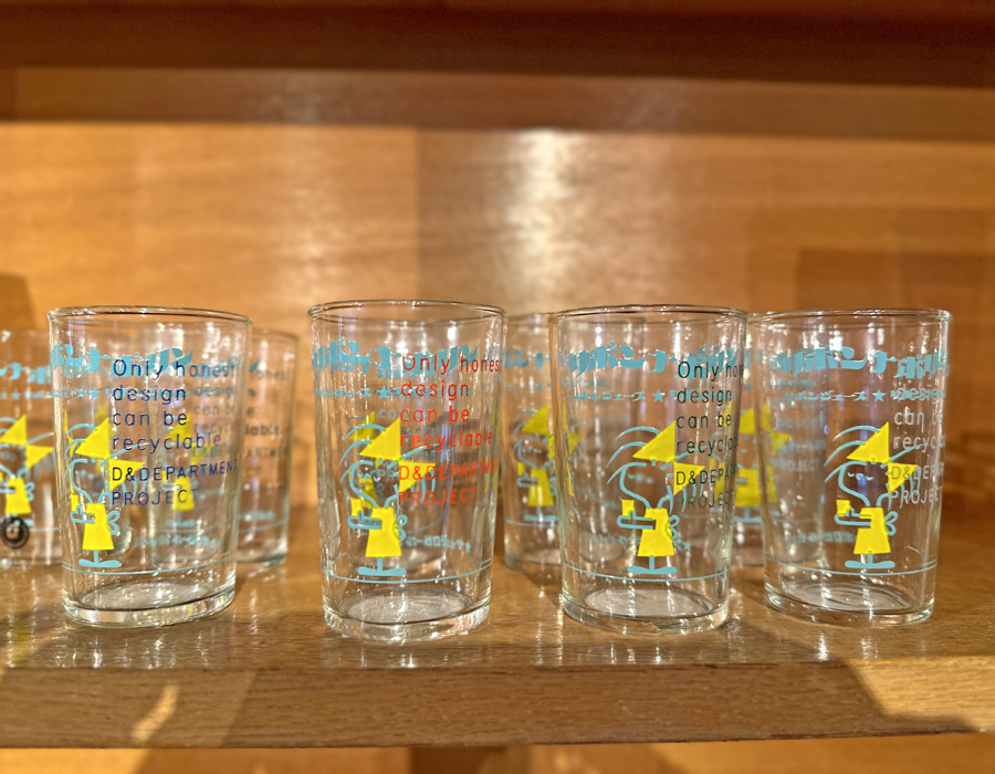 「re-drop」というD&DEPARTMENTのリサイクルプロジェクトで、業務用やノベルティ用に作られた昔懐かしいグラスにメッセージをプリントしリプロダクトしたもの。