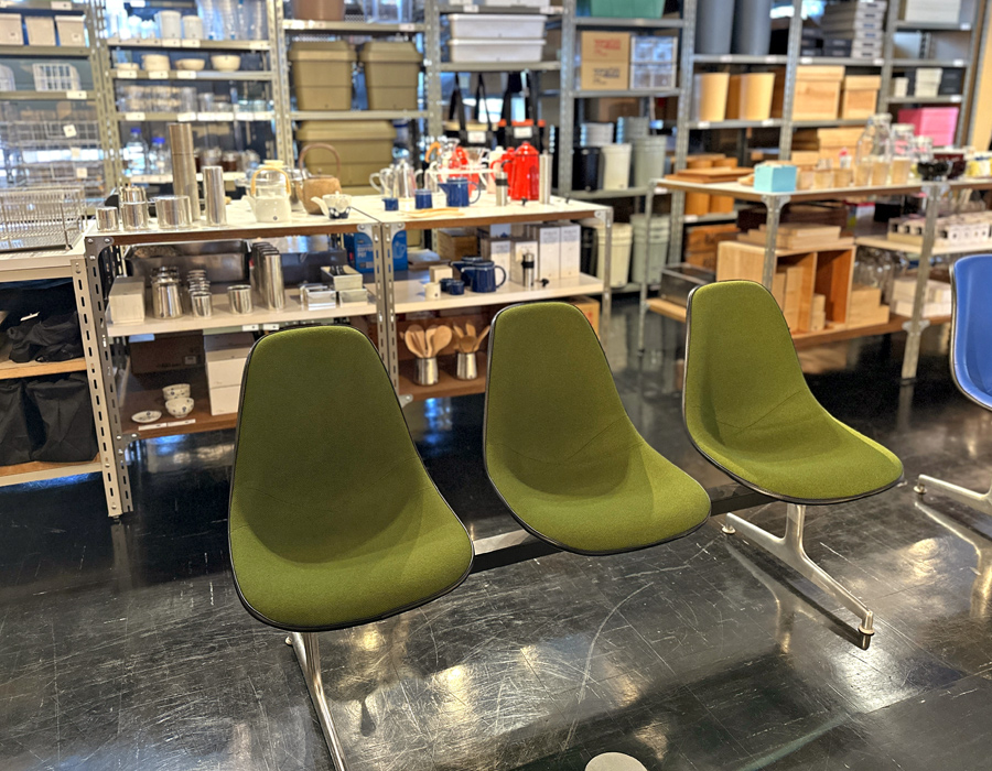 80~90年代のイームズのシェルチェアが取り付けられたタンデムシートは、空港など公共施設などで使われていたものでかなりのレアアイテム。D&DEPARTMENTでは、昨年とある公共施設から30台入手したそうで、この日も3台のタンデムシートが並んでいました。