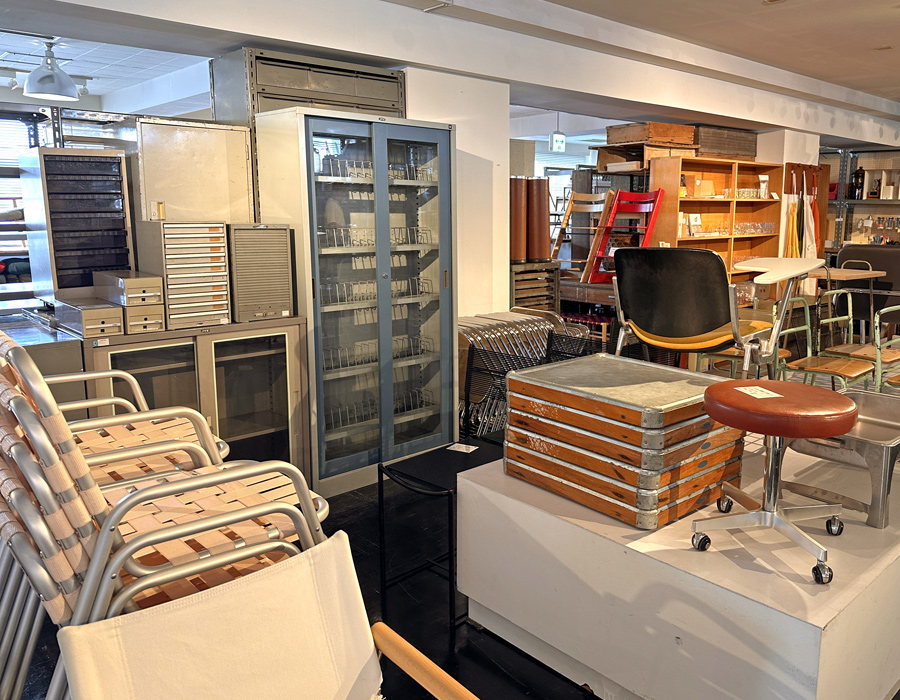 それこそ学校の職員室やオフィスなんかで使われていた収納棚があったり、保健室の丸椅子これだった~的な物など、昔懐かしいデザインのものがたくさん。