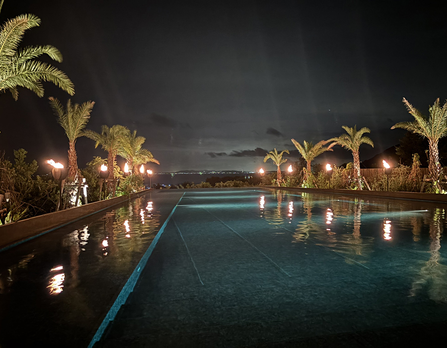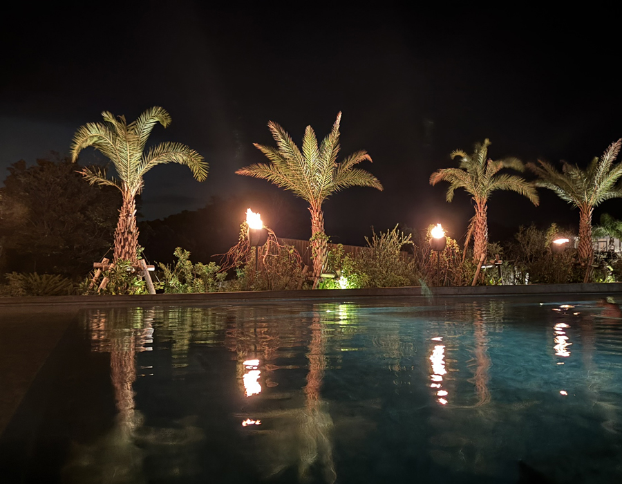 プールサイドに灯される炎が印象的で大人な雰囲気です。