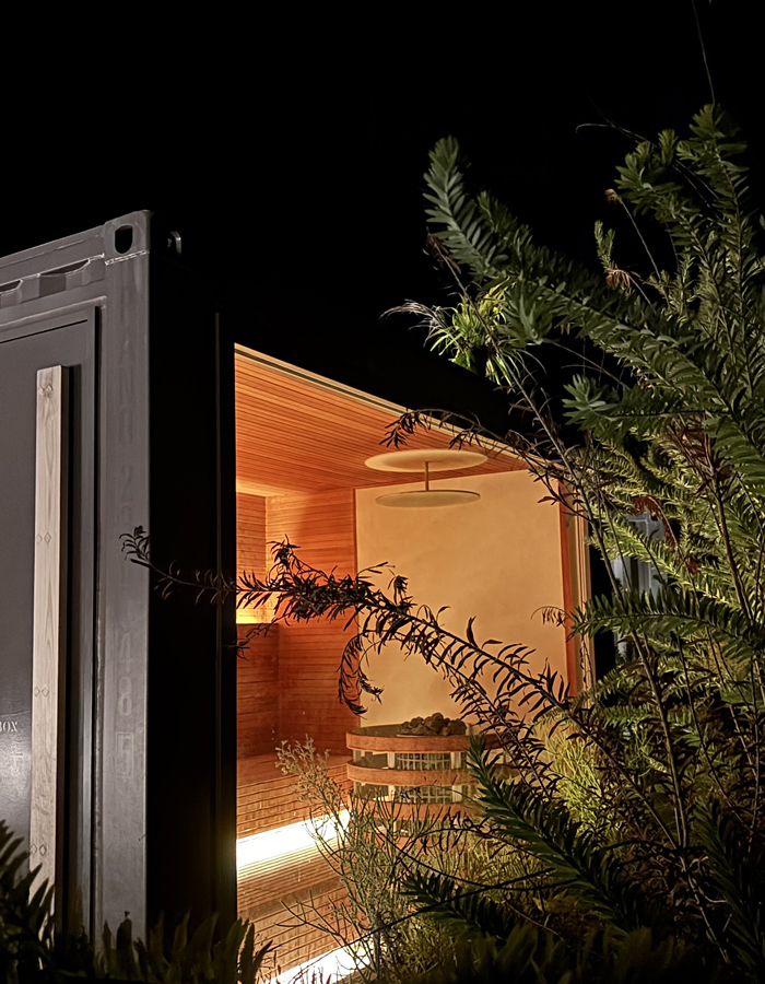 2つ目のはコンテナサウナ。昼と夜で違う雰囲気が楽しめます。