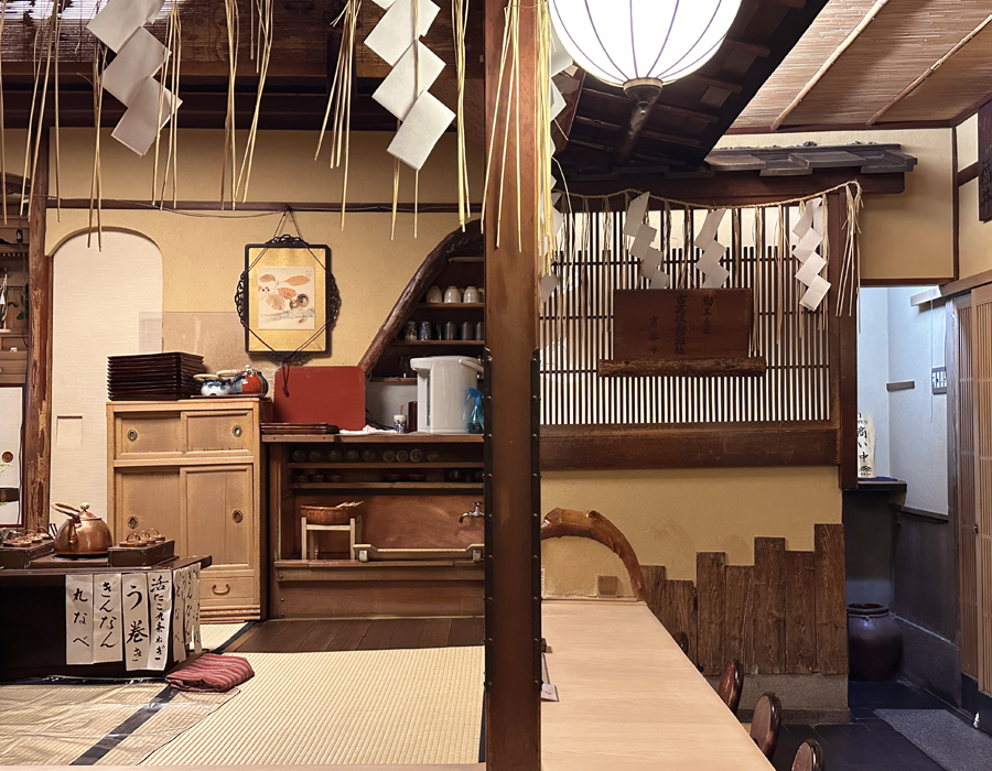 店内は能舞台を模した座敷を囲むカウンター席と、壁際にも三条・五条大橋の欄干を見立てたカウンター式のテーブル席があります。