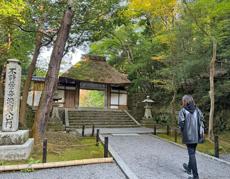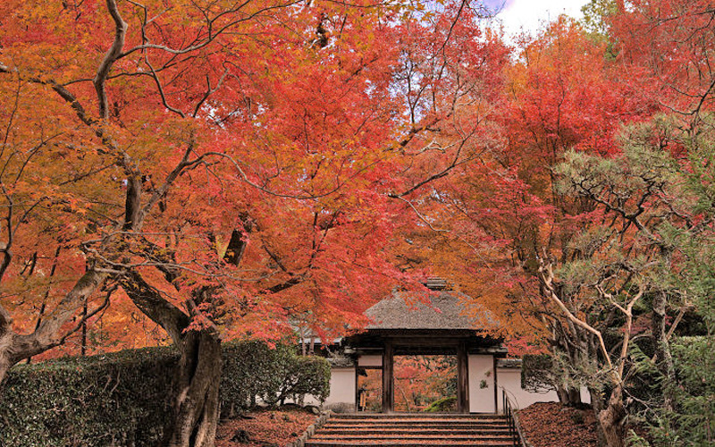 苔でおおわれた茅葺の山門とそれを取り巻く色鮮やかな紅葉がとても美しく、小さいながらも人気のお寺なんです。
