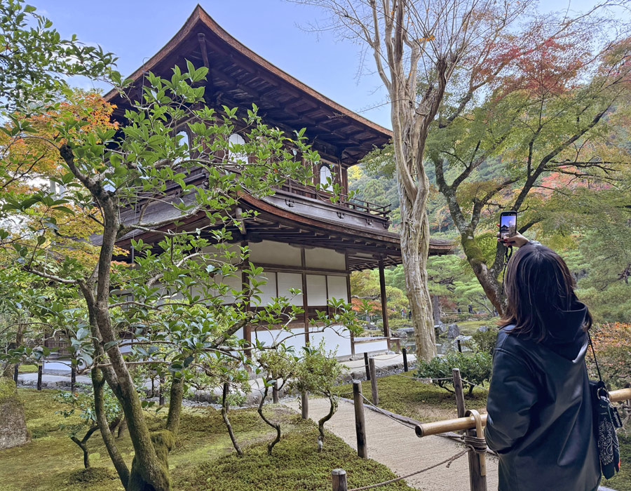 美しい日本庭園に佇む銀閣寺とその背後に迫る東山が織りなす風景。