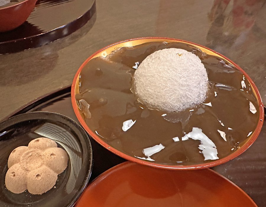 スタッフの方から余った黒みつときな粉を中央の氷にかけてかき氷として召しあがってくださいと。