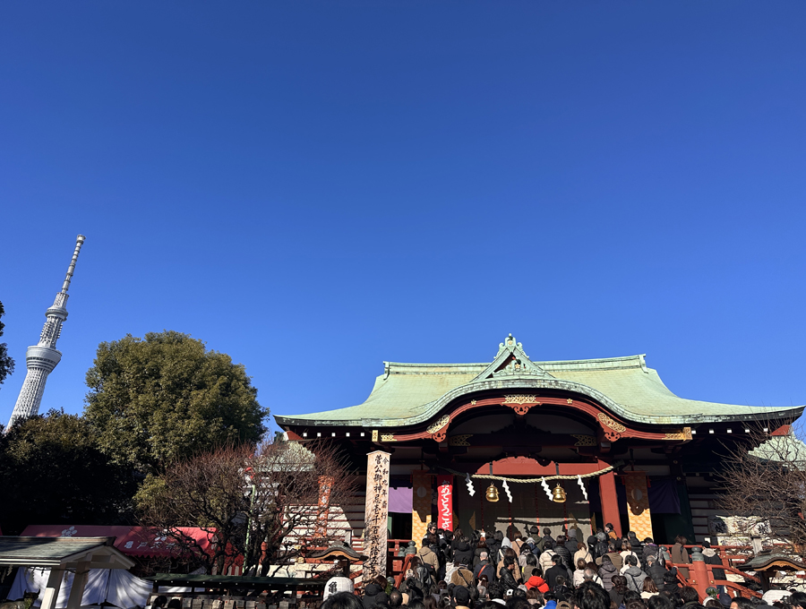 スカイツリーから1.5キロほどの場所にあるこちらでは、本殿とスカイツリーを拝むことが出来ます。
