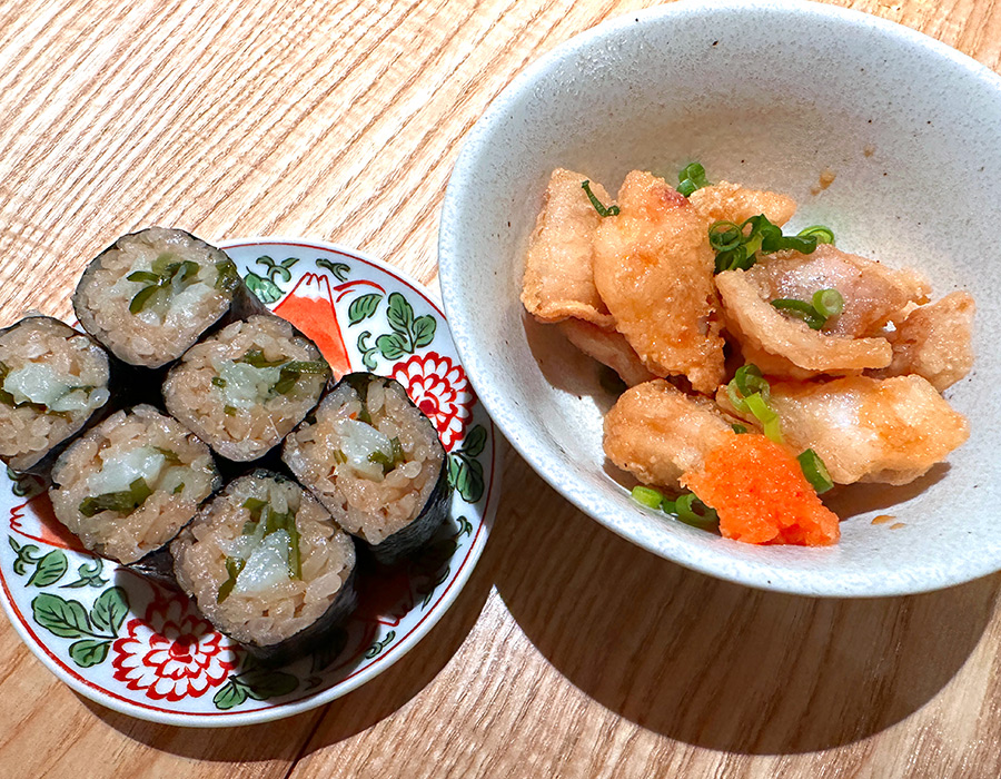 アテ巻きのえんがわワサビ巻きと水だこの唐揚げ。