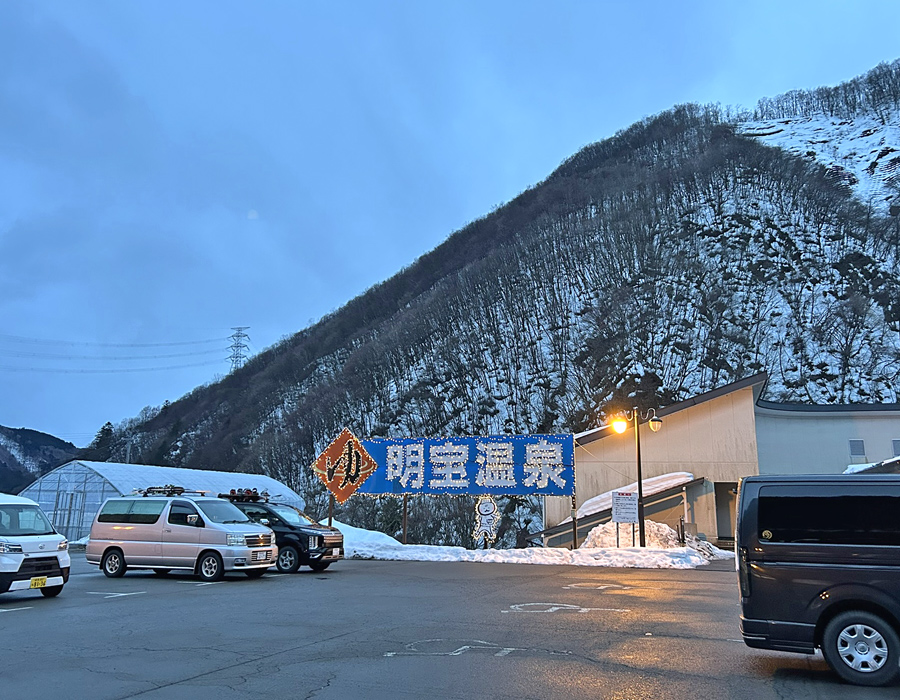 やってきたのは、明宝温泉。360度山に囲まれた場所です。