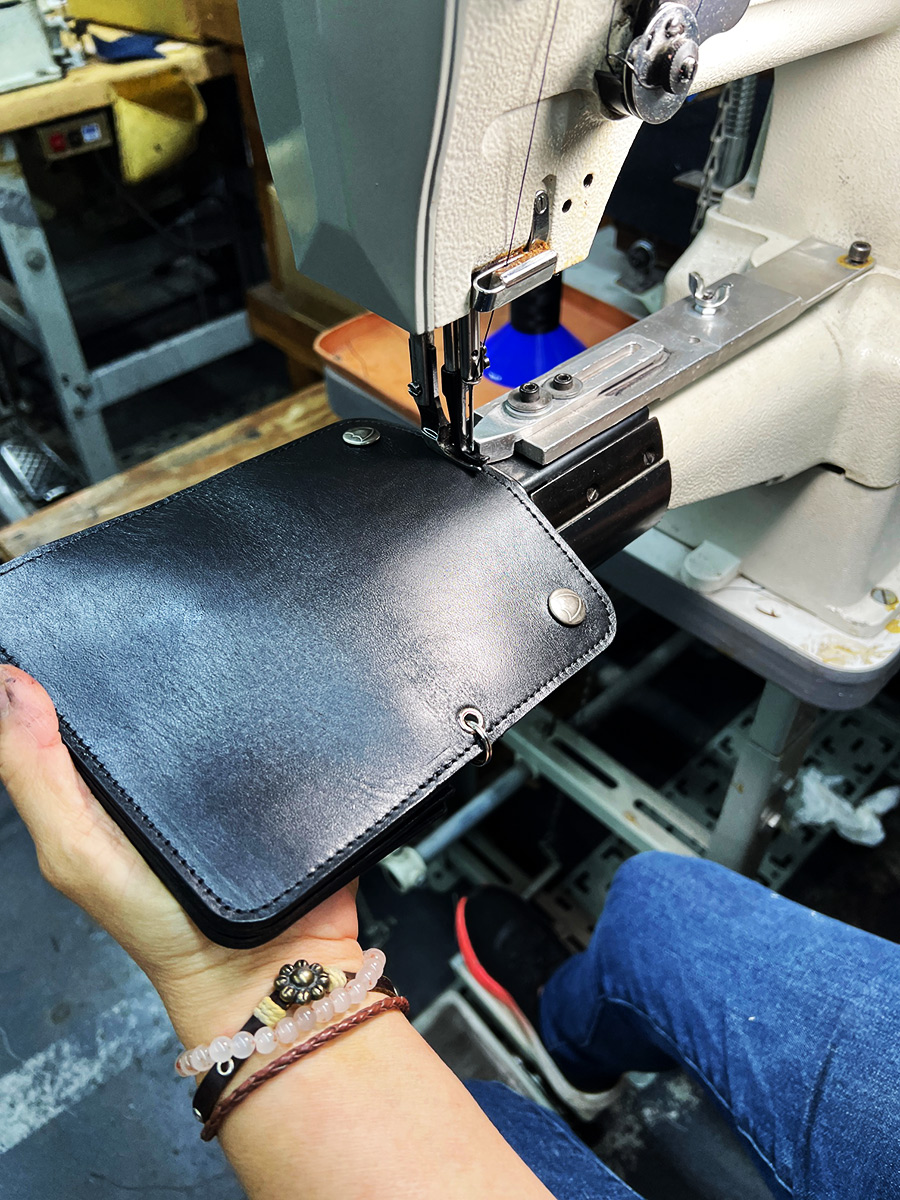 レザー専用のミシンで、リズム良く、流れるように作業が進んでいきます。