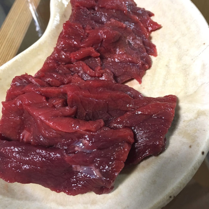 無事到着し、早速馬刺し。くさみも一切なく、新鮮な赤身のマグロのような。なんと表現してよいか、、やばいです。恐れ入りました。すんげーーー美味。