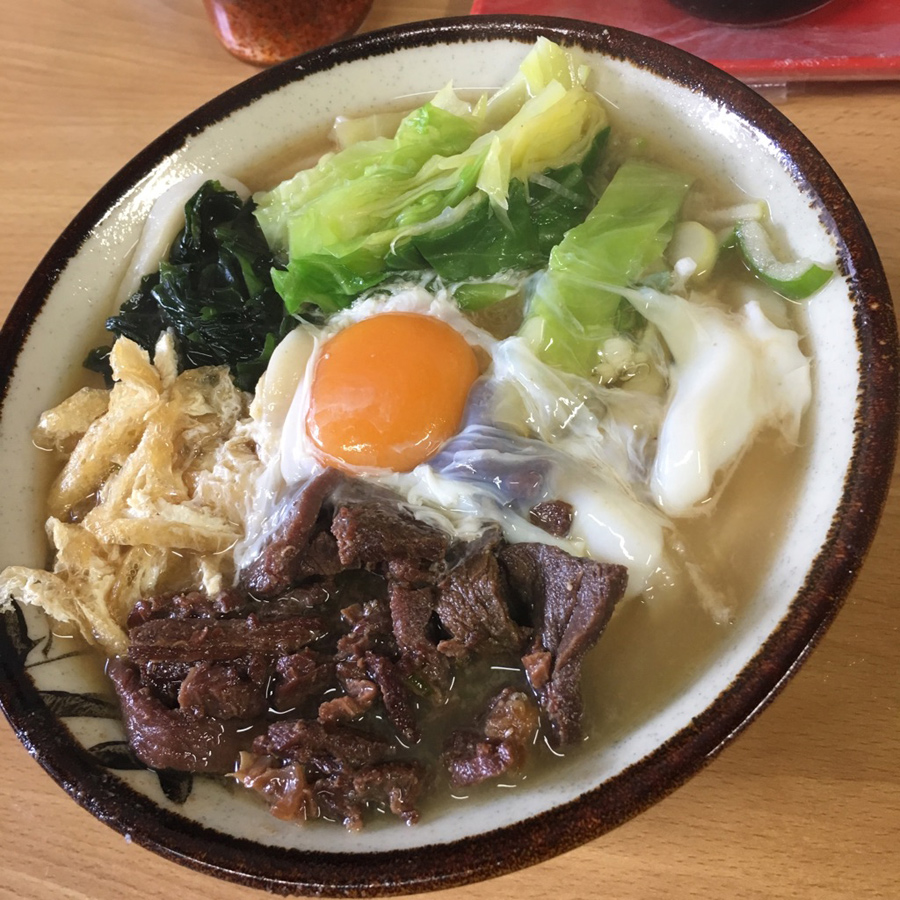 馬肉、煮キャベツ、揚げ、わかめ、葱に半熟たまご。