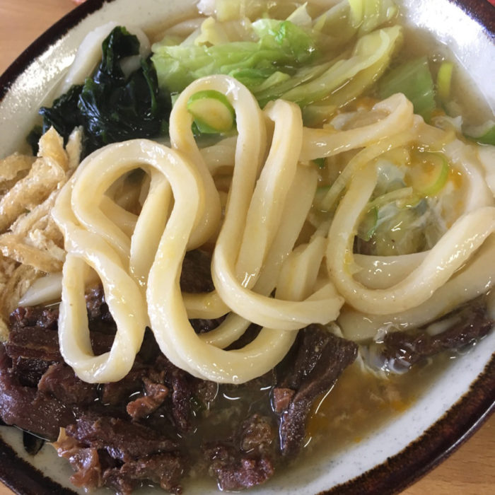 太めのうどん。ズルズルというかガツガツ食べます。結果、最高。バランスよくめちゃくちゃ旨い。
