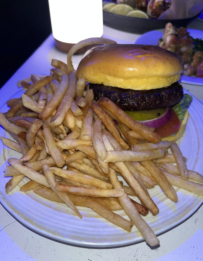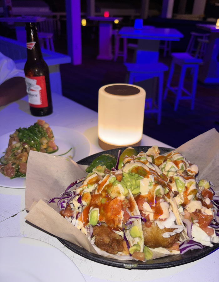 フィッシュタコスとハンバーガーと昨日食べてハマったポキサラダをオーダー。