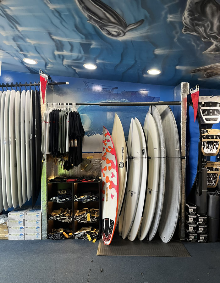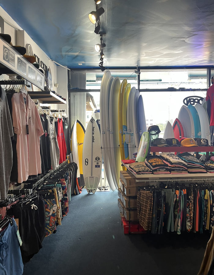 ボードやウエットスーツはもちろん、オリジナルのアパレルなども数多く取り扱いをしていました。