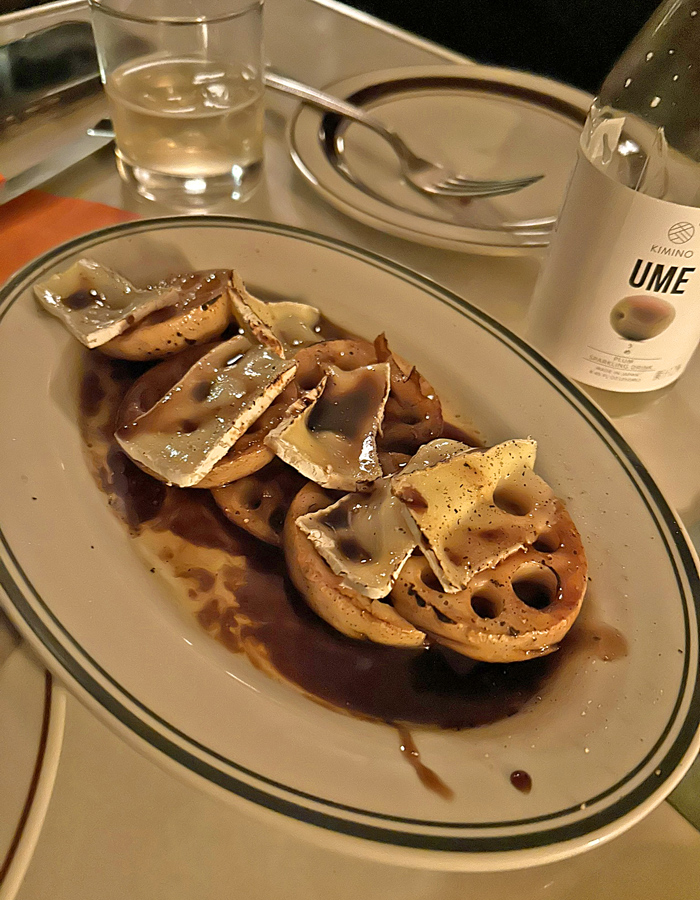 焼いたレンコンにブリーチーズがのっており、バルサミコ酢で和えたもの。