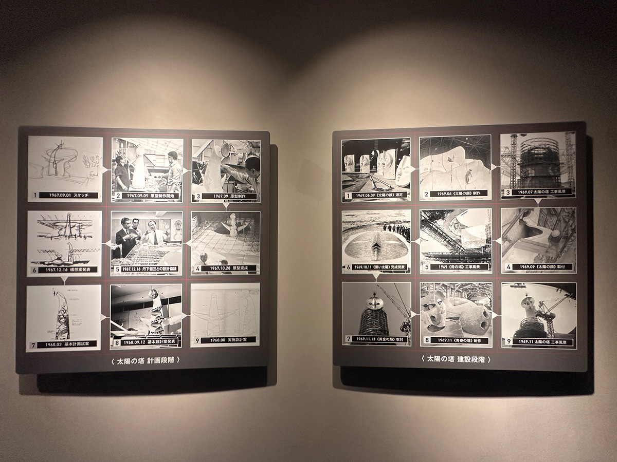 「生命の樹」ゾーンから出口に向かう階段には、太陽の塔が建設されるまでの様子も紹介されていました。