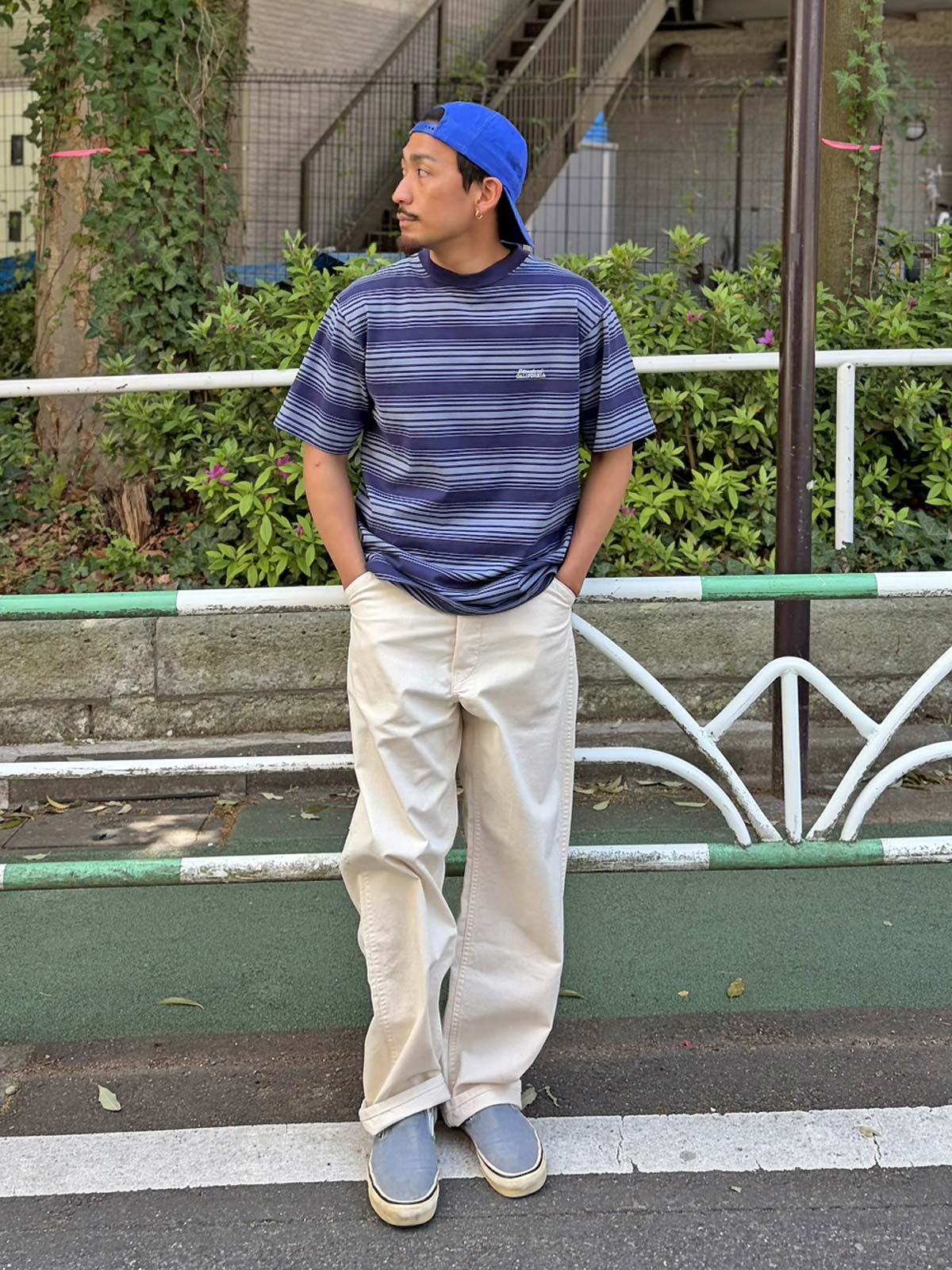 キャップと足元もブルーベースのアイテムで合わせ、爽やかな春スタイルで組んでみました。