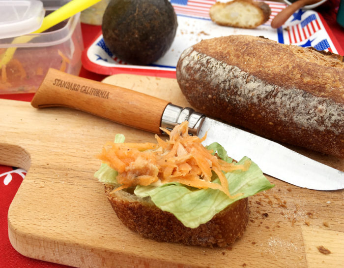 天候が危うかったので、バーベキューは断念し下準備をした材料で即席サンドイッチ。