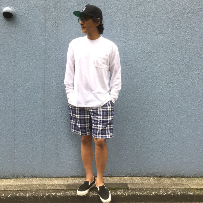 この中途半端な季節にちょうどよく、バランスの良いロンTとショートパンツの組み合わせ。