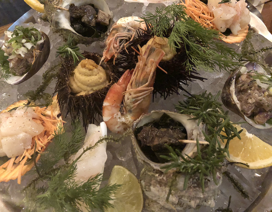 雲丹プリン、有頭海老のボイル、サザエのオリーブオイル和え、鯵のタルタル、甘海老ホタテマリネ、鮮魚のマリネが盛り合わせになった贅沢すぎる一皿。