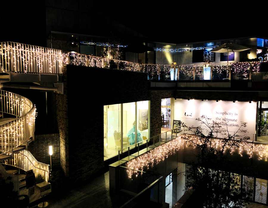こちらラ・フェンテ代官山も 個性的な色合いのイルミネーションで彩られています。