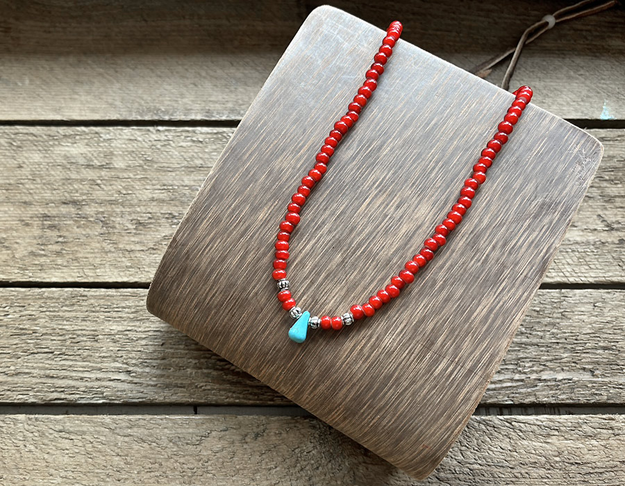 色鮮やかなチェコ産のホワイトハーツビーズ(5mm)と、ボタンワークスのアイコンでもある雫型のターコイズ、メタルビーズを組み合わせたこちら。