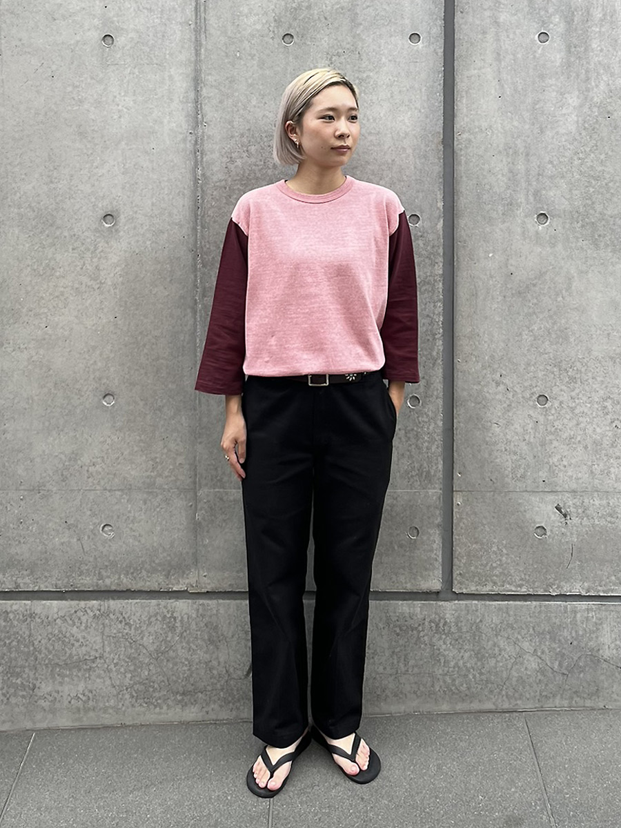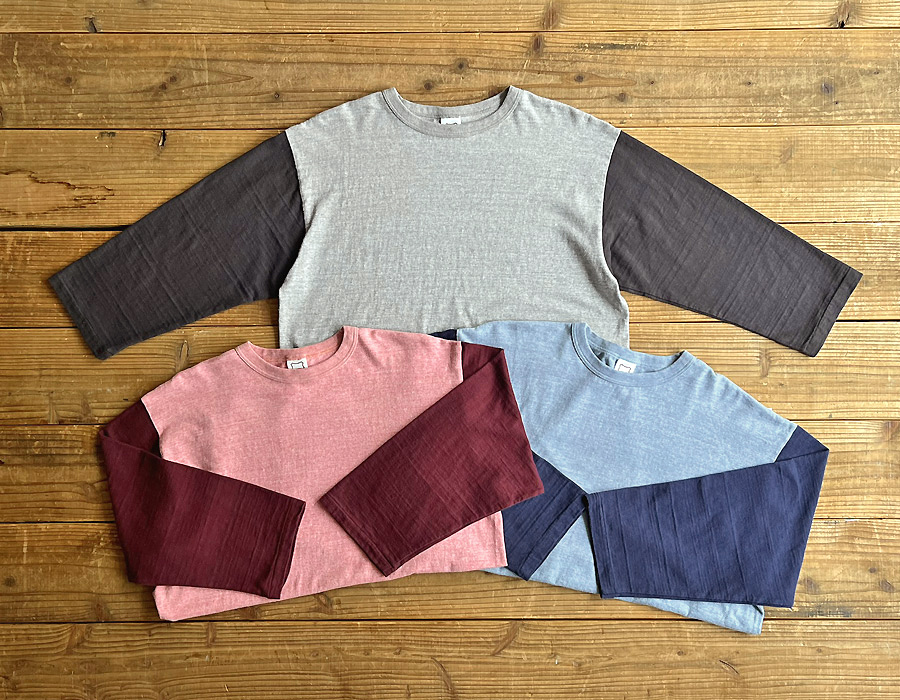 今回はヴィンテージをイメージして袖を同色系の天竺生地で切り替えたセットインスリーブに。