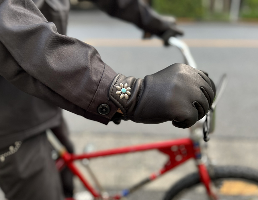 そんな老舗グローブメーカー「ガイアーグローブ」のボア付きディアスキングローブにHTCがスタッズワークを施しました。