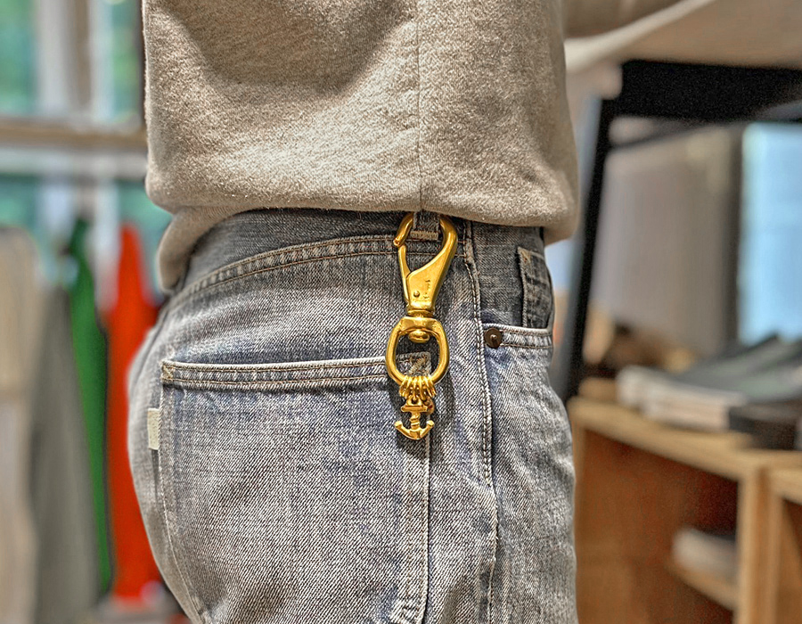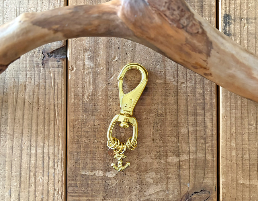 真鍮製のヨットナスにアンカーチャームとリングを組み合わせたキーホルダー。