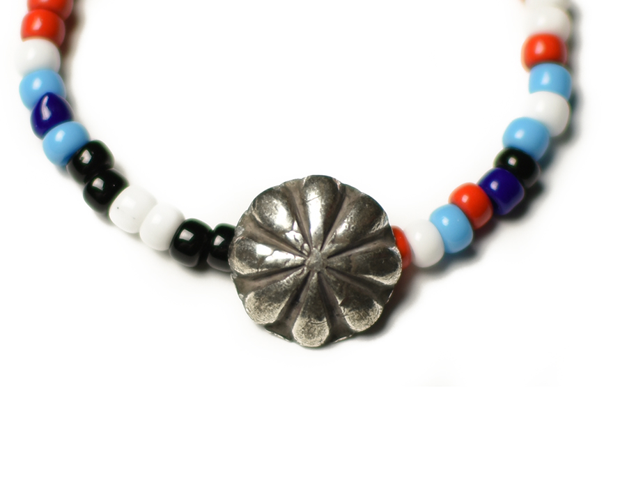 マルチカラーのガラスビーズとコンチョを組み合わせた爽やかなカラーリングのブレスレット。