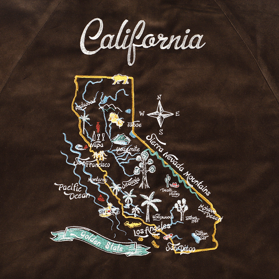 サテン面はスポーツの盛んなカリフォルニアをイメージしたスタジャン仕様のロゴパッチ刺繍を落としこみました。