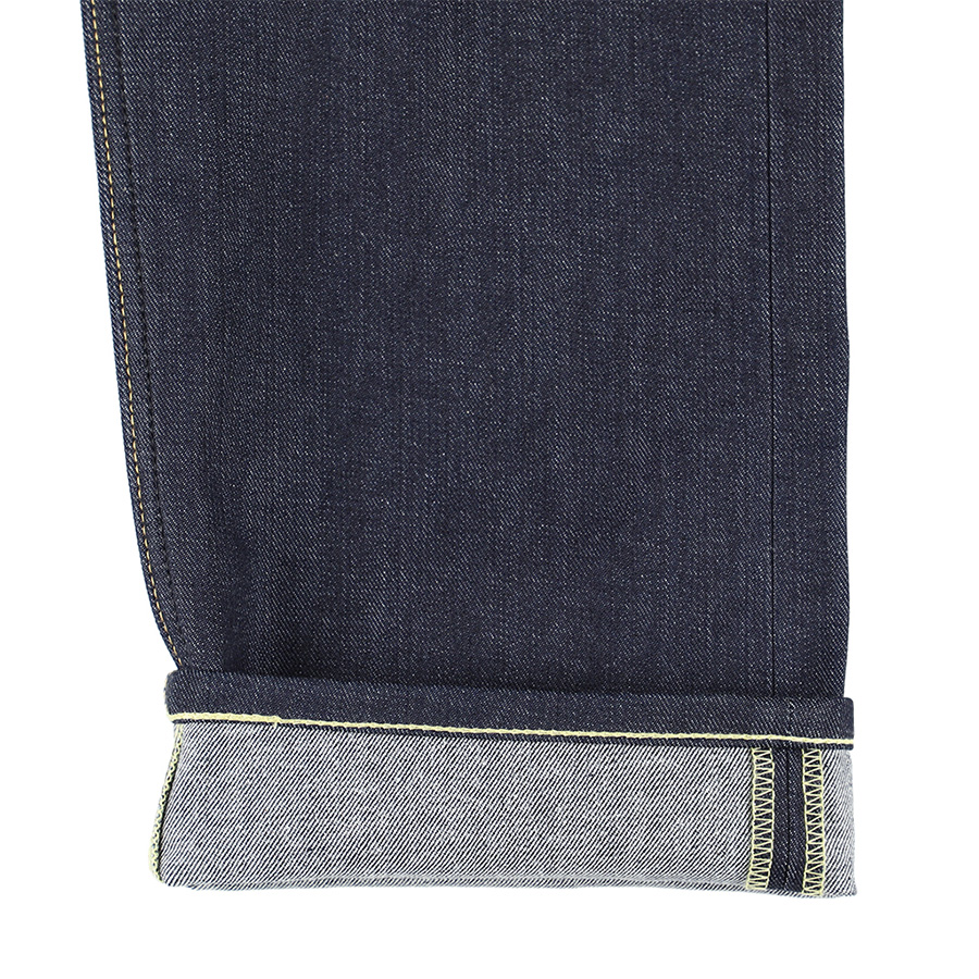 パリッとした硬さと色落ち前の深く澄んだインディゴブルーはリジッドならでは。