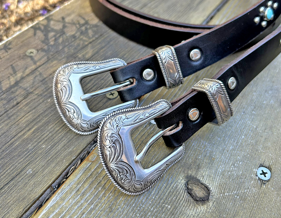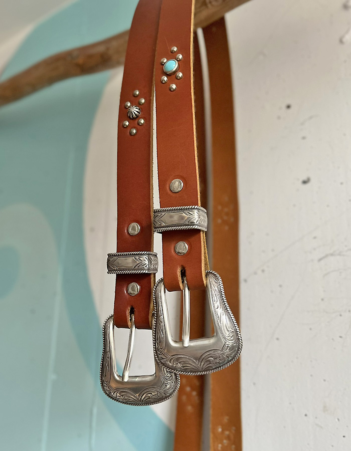 1inch幅のベルトに、バックル・ベルトループ・剣先に装飾を施したウェスタン仕様の金具を使用。