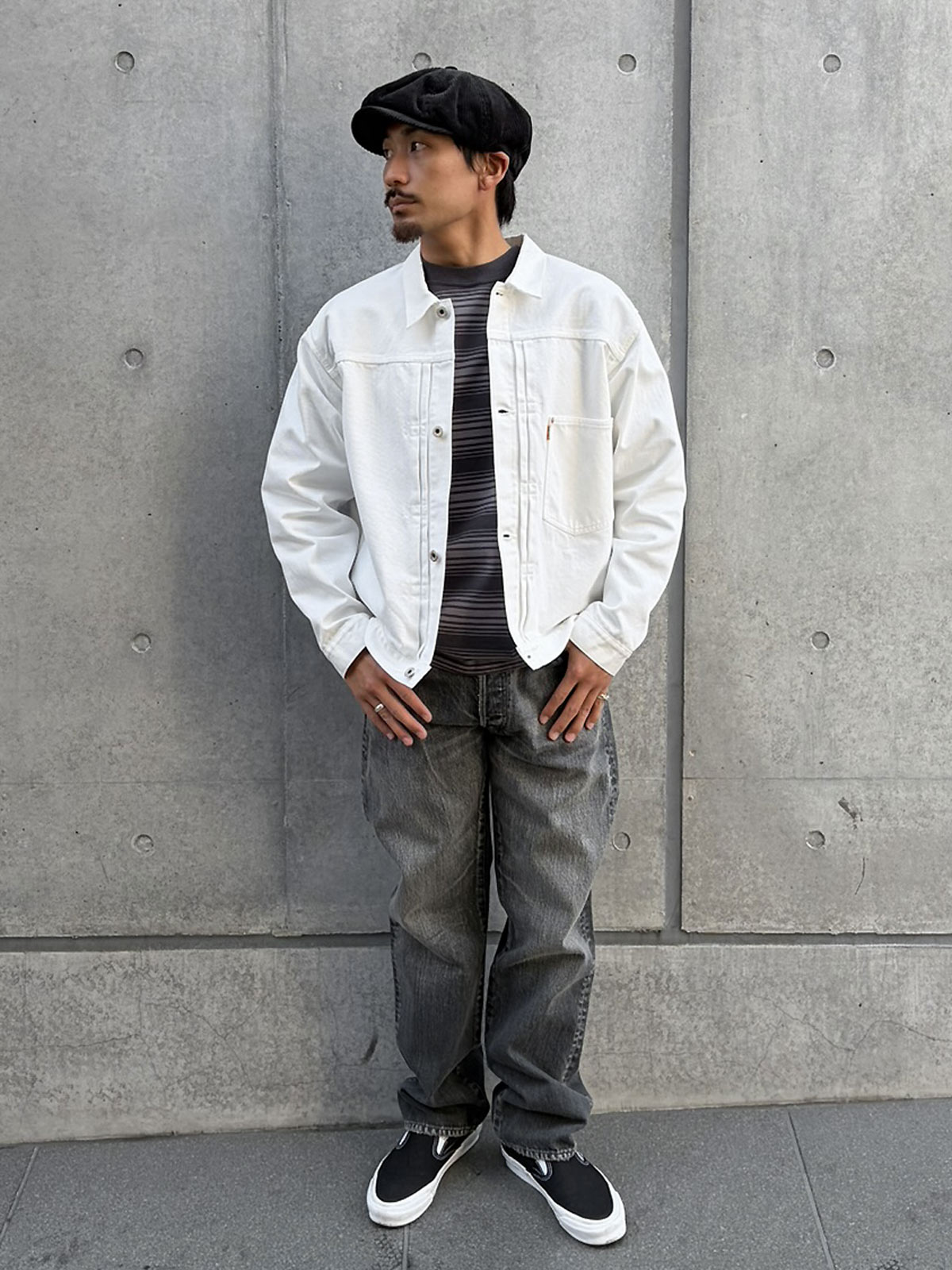大戦モデル特有の4つボタンやフラップなしの1ポケット、月桂樹ボタンに刻印無しのリベットなどディテールはそのままに、今着やすいシルエットに落とし込みました。