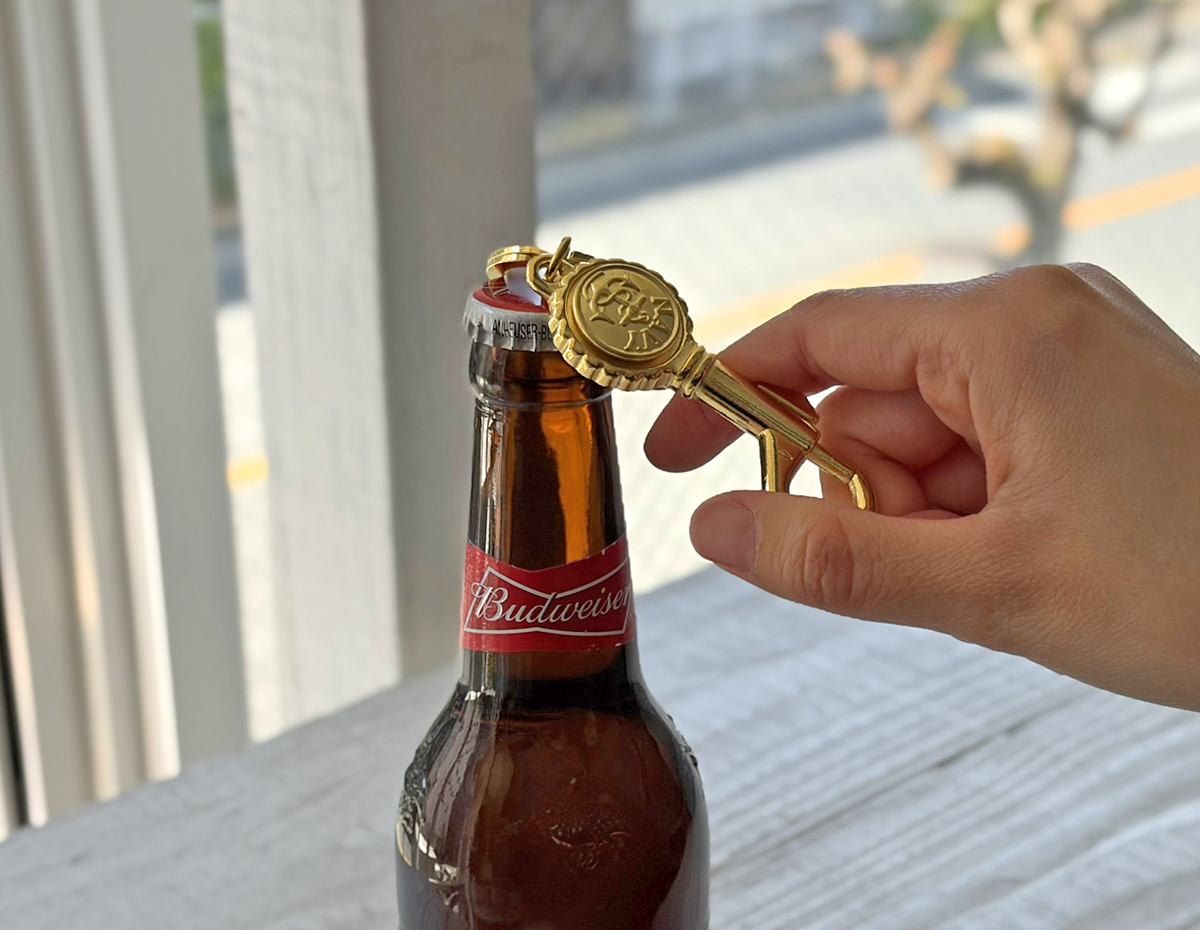 Button Works のボトルオープナーと2重リングを組み合わせたキーホルダー。