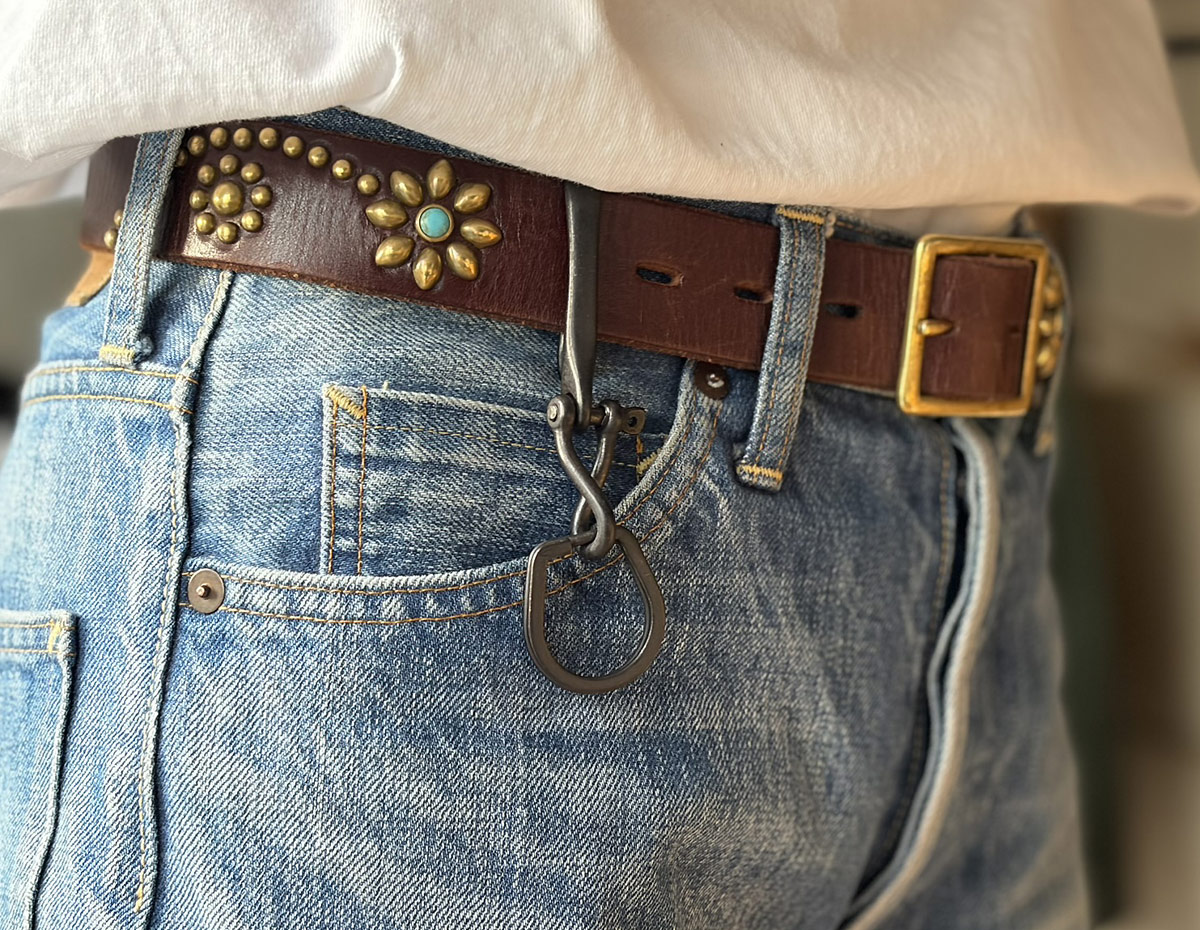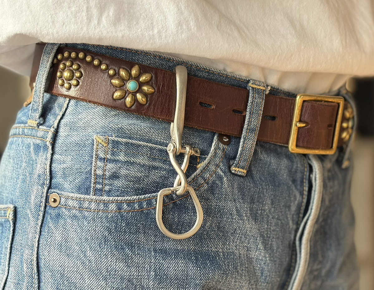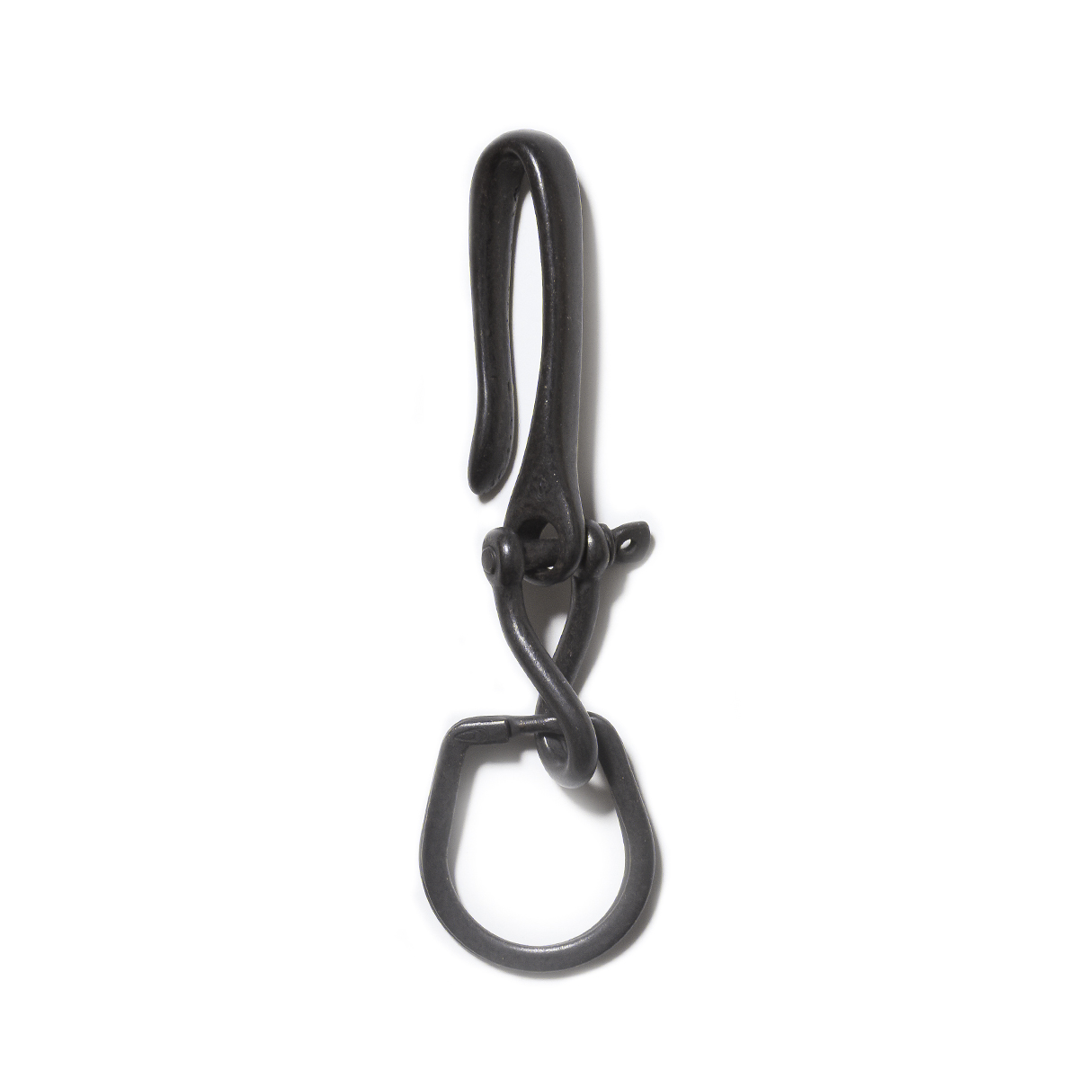 Button Worksオリジナルの釣り針型フックに、ツイストシャックル、定番のホースシューリングを組み合わせたキーホルダー。