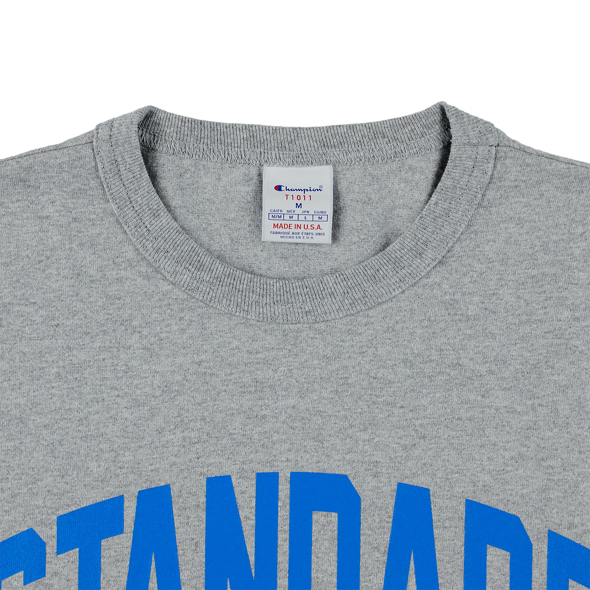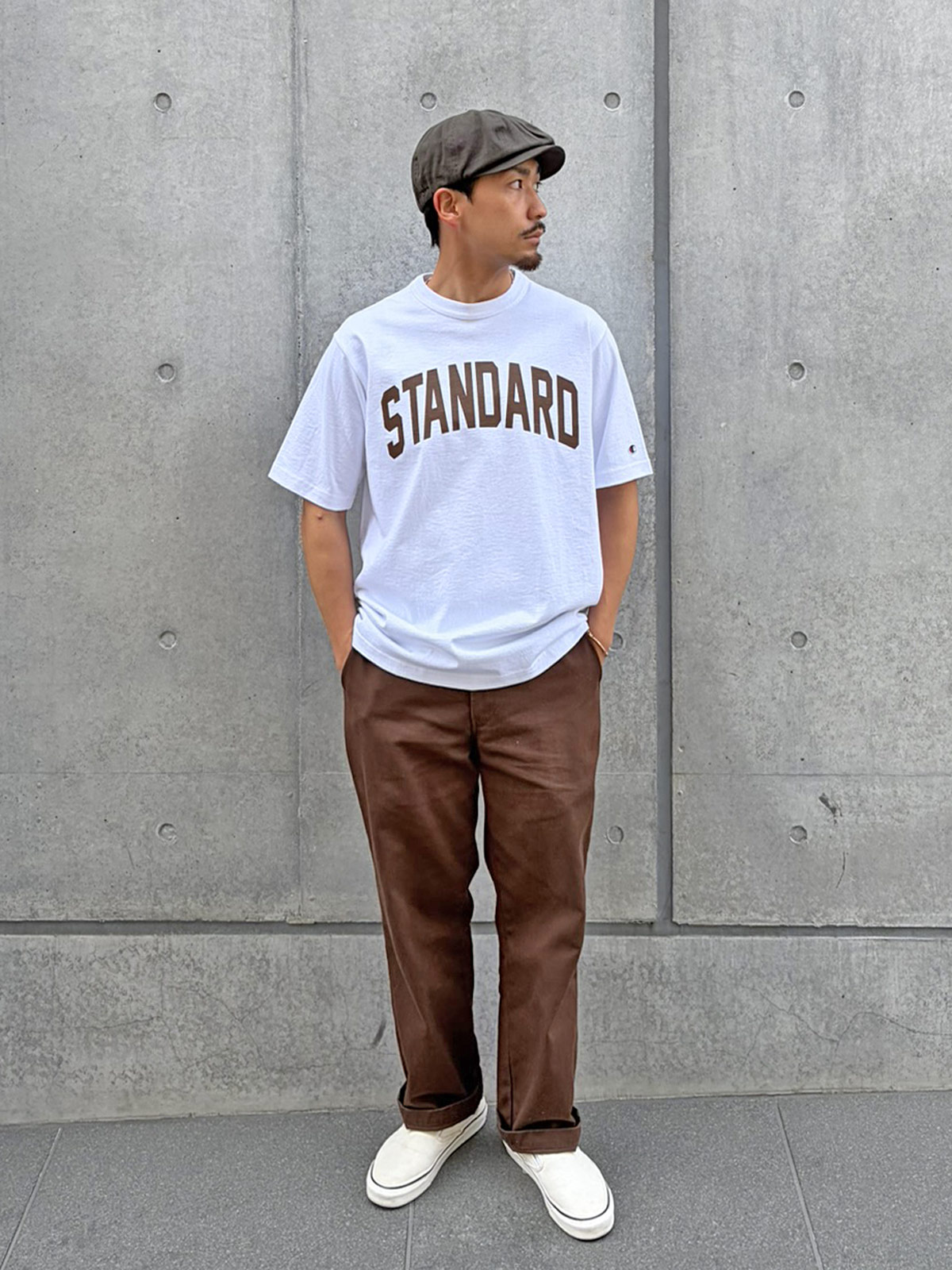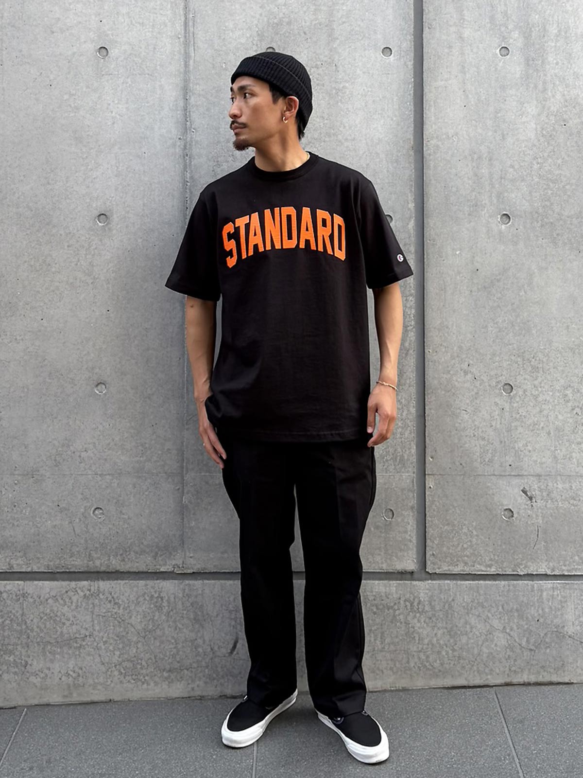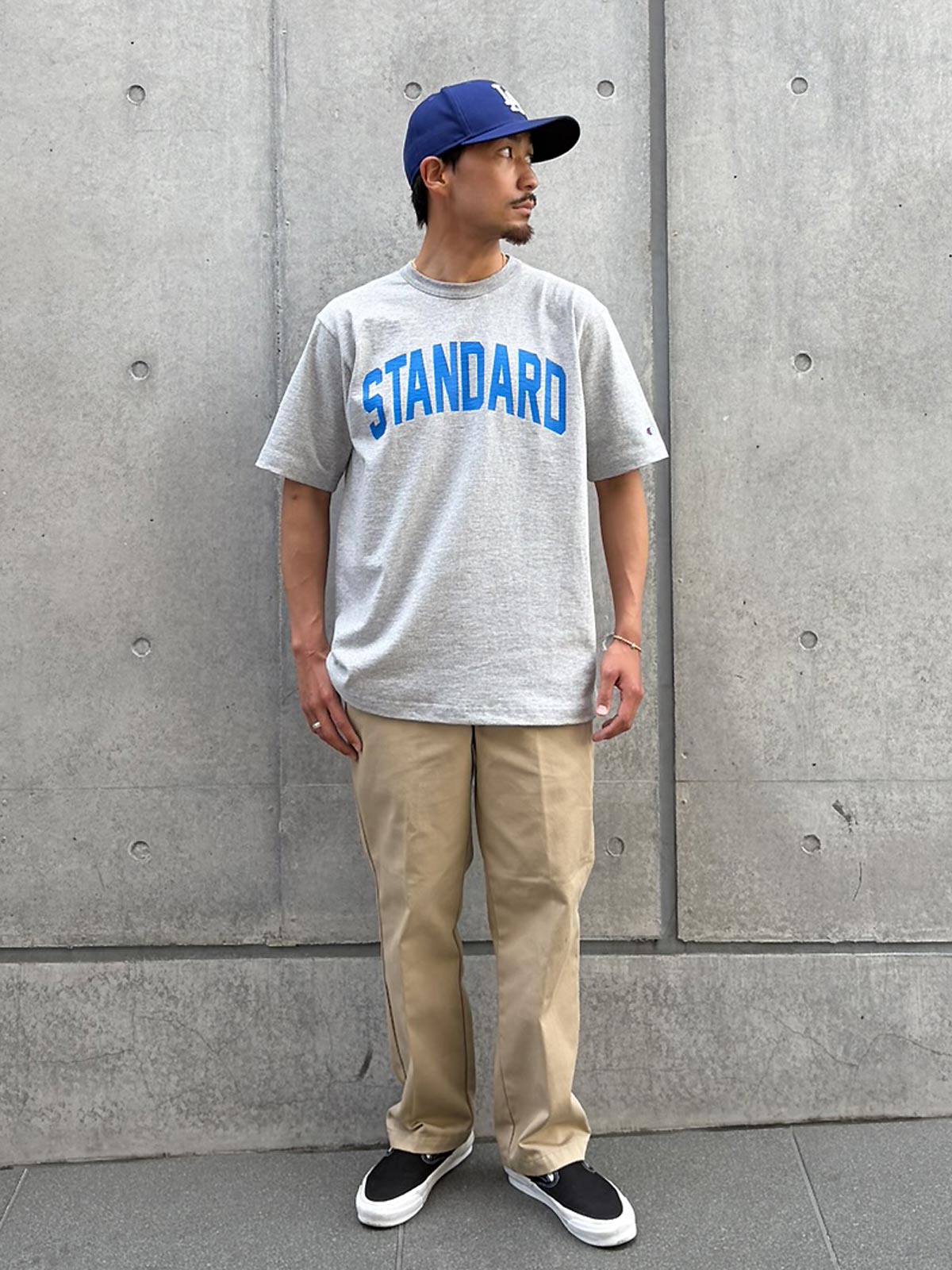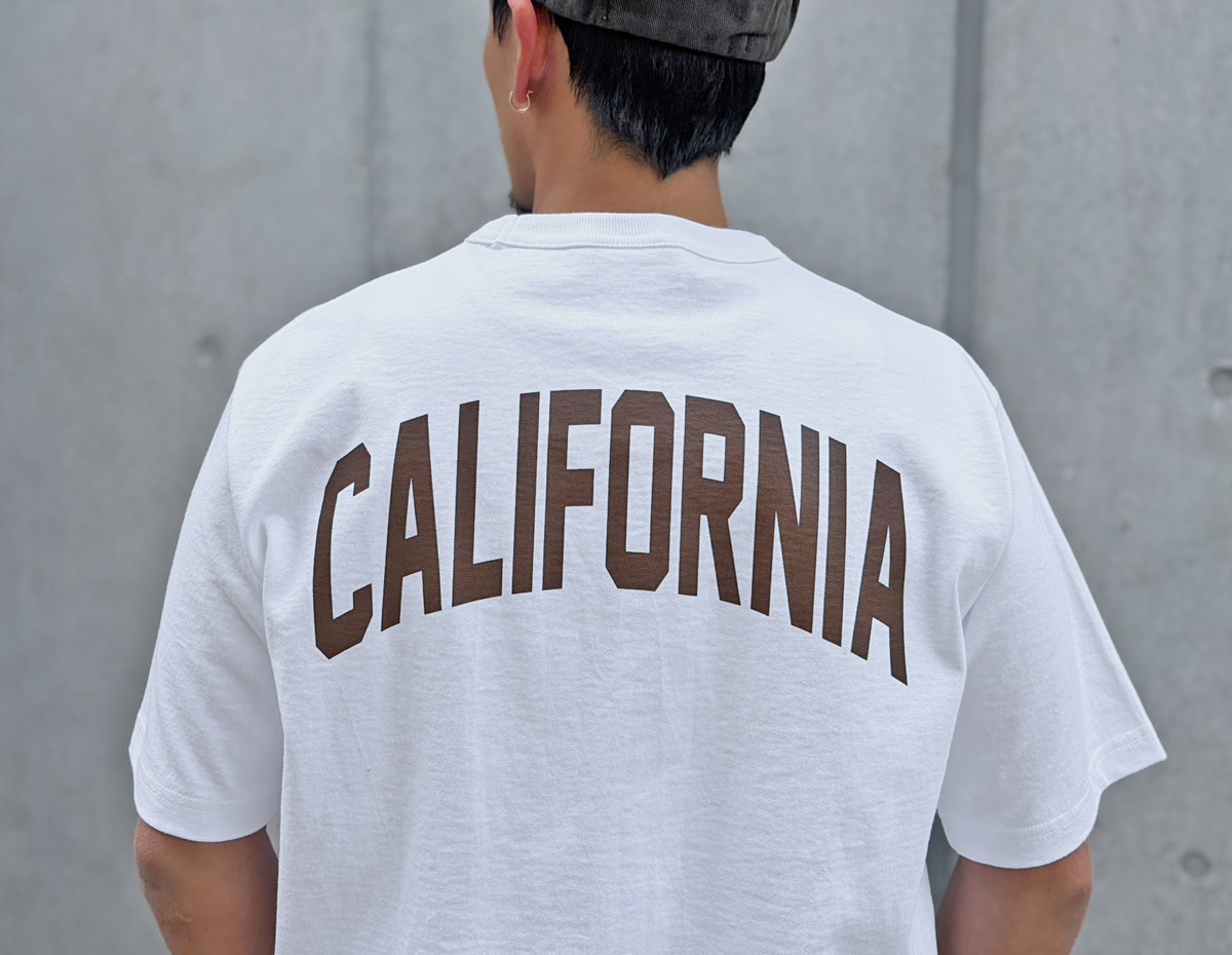 今回はカレッジ系のラウンドロゴで、フロントに「STANDARD」、バックには「CALIFORNIA」をラバープリントしました。